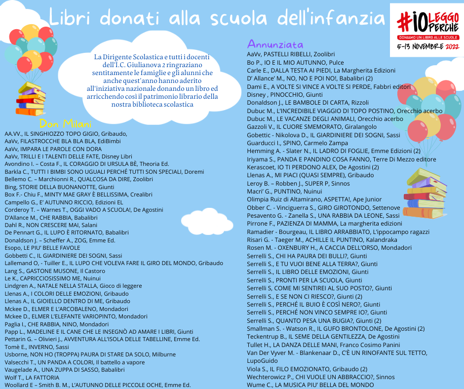 ELENCO LIBRI DONATI PER L’INIZIATIVA “IO LEGGO PERCHE'” Qualcosa non è accessibile? faccelo sapere × Questo contenuto ti è stato utile? Pessimo Non buono Sufficiente Buono Ottimo! Hai suggerimenti per migliorarci? Ai sensi dell’art. 13 del Regolamento UE 2016/679 GDPR ho preso visione dell’informativa di questo Istituto Invia Qualcosa non è accessibile? faccelo sapere